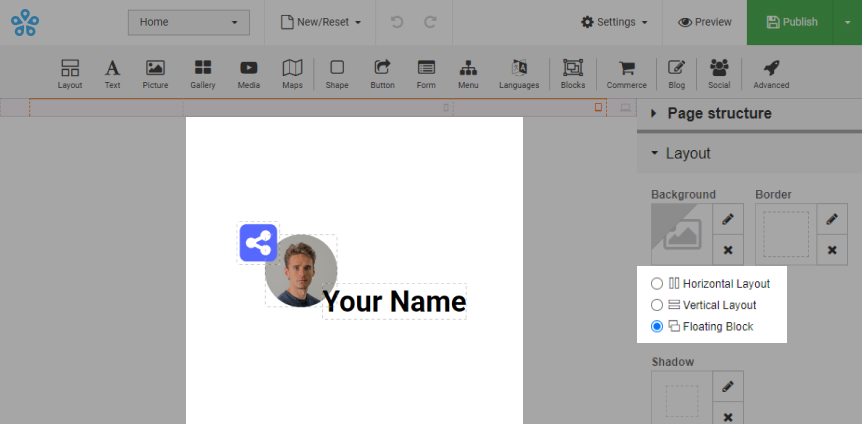 Change elements position in layout. Choose from "Horizontal Layout", "Vertical Layout" or "Floating Block" in right toolbar. - Alignment: